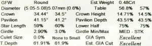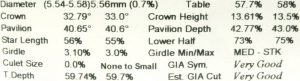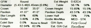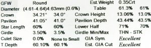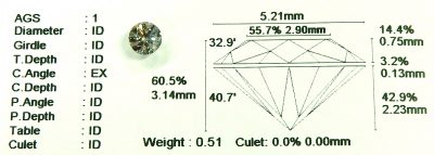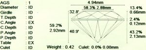 When it comes to diamond grading there is little argument that The Gemological Institute of America is the most widely recognized authority when it comes to non bias quality evaluation. These reports are usually only seen at premium jewellers who value an accurate document over the more sales oriented type appraisal report seen at most jewellery stores. Often these appraisal certificates are optimistic in their opinions of quality and price. GIA do not report on pricing as they are only interested in the quality of diamonds and other gems. The American Gem Society is another institution held in highest regard for their uncompromising standards. Some would argue that they have even tougher standards than GIA when it comes to cut grading. This diamond was compared to AGS standards for an ideal cut. Its geometry was perfect on all counts except for a slightly shallow crown angle of 32.9 degrees when it should have been no more shallow than 33.7 degrees. This 0.8 degree deficiency automatically rendered the diamonds cut to just excellent.