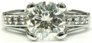 2.00 carat diamonds are the new 1.00 carat. Maybe it’s a sign of our evolving business or the amazing values we offer but we’re getting more calls for bigger diamonds all the time. Here is a great opportunity to get a great looking 2 carat estate diamond for a significant discount over the replacement cost. The fully certified Gemological Institute of America diamond faces up very white with a strong “I” colour. The SI2 clarity grade was established due to the presence of twinning wisps. Twinning wisps are a preferred clarity characteristic because they are usually semi transparent or translucent. They typically go unnoticed without artificial magnification. The other pertinent quality characteristics are, very good overall cut, very good polish, very good symmetry and no fluorescence. The full October 2017 GIA report can be seen online here. Always insist on a GIA report if you’re considering a significant diamond purchase. All certificates use GIA developed grading language but many do not grade to GIA’s strict standards. It’s very common to see SI2 graded diamonds that are actually I1 clairty. We also see diamond colour grades that are often optimistic when compared to GIA standards by a grade or two. An appraisal from a GIA trained gemologist still doesn’t ensure it has been graded to the standards of the laboratory. GIA DO NOT appraise diamonds and they are not interested in the commerce of diamonds. This allow a completely impartial opinion of quality. If you’re going to spend well into 5 figures for a diamond take a few minutes and watch this video by Martin Rapaport discussing over graded diamonds and inaccurate reports. Mr. Rapaport produces a wholesale diamond price list that is widely followed in the industry. This guy knows his stuff. Our properly graded estate diamond is currently set in this 14 karat white gold ring.