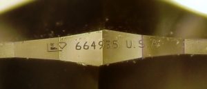 You’ve got to be a real diamond enthusiast to recognize the name Lazare Kaplan. I’d imagine even the majority of jewellers have never heard of the Kaplan family. They’ve been master diamond cutters for over 100 years. They were among the first to cut diamonds according to a strict mathematical formula developed using the science of optical physics. This precise blueprint for diamond cutting showcases optimum levels of brilliance and dispersion. Only a tiny fraction of diamonds are cut with this template in mind as it is more time consuming and typically yields a smaller finished diamond from a given rough diamond crystal. I think this is only the 2nd example of a Kaplan diamond we’ve ever had come through our estate department. It weighs 0.58 carats and measures 5.35mm x 3.22mm with a tiny table promoting incredible dispersion. Needless to say the polish and symmetry of these diamonds are as good as it gets too. Despite a slightly warmer K colour as compared to our GIA master diamonds this diamond appears much more white. The slightly yellow tint is almost totally lost in the fireworks. It’s a little ball of fire just waiting for you to set it in a ring or pendant. A few small white crystals close to the edge at 3 o’clock qualify this diamond as a SI1 clarity. With strategic claw placement these inclusions could be completely covered making the diamond look more like a VS clarity stone. Each Kaplan diamond has been uniquely laser engraved with a registered number.