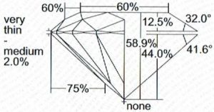 We apologize to all the other jewellers that simply can’t afford to compete with the sort of value our estate diamonds offer. Our latest estate diamond came to us with a minor chip on the culet. We had the chip repaired, the overall cut improved then off it went to the Gemological Institute of America for certification. The fresh August 21 2018 report confirmed what we knew all along. We don’t need a piece of paper to appreciate a pretty diamond but a GIA certificate sets the bar when you’re comparing diamonds. If your jeweller doesn’t sell GIA certified diamonds ask them why not? If it’s not a GIA certified diamond you may not be comparing apples to apples. GIA are the industry authority when it comes to unbiased quality evaluation. Practically ALL important diamonds come with GIA certification. The geometry of this diamond falls just short of excellent cut with a slightly shallow crown angle and crown height.