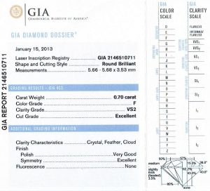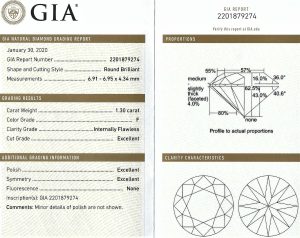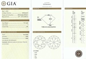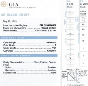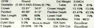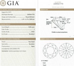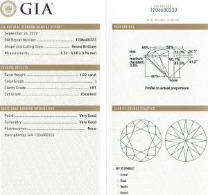 I bet if you look long enough you’ll be able to find another GIA certified diamond of the same quality for about the same price as this (maybe even a bit less). I doubt you’ll find one that measures over 6.6mm average diameter as this one does. In fact most excellent cut 1.00 carat round brilliant cut diamonds only measure around 6.3mm to 6.4mm. The diamond business is all about hundreds of millimeters and this one looks more like a 1.10 carat due to the extra couple of tenths of a millimeter. A GIA summary report can be seen online here.