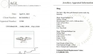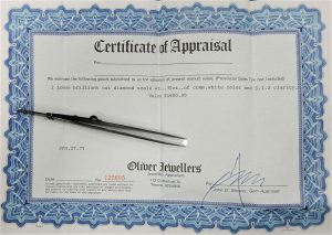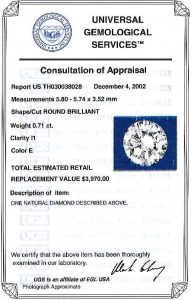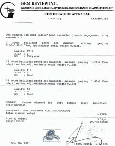 As with most outside appraisals submitted with jewellery we see, the value attached is a little optimistic in our opinion. To replace the ring and diamond at a more competitive retail price we feel an appraised value should be closer to $11,650.00 CAD ($9,100.00 USD). The ring and diamond are estate priced at $8155.00 CAD. The diamond is available without the ring for $7000.00. Stock #e11310.