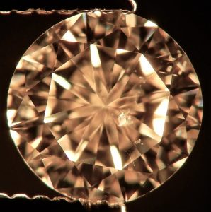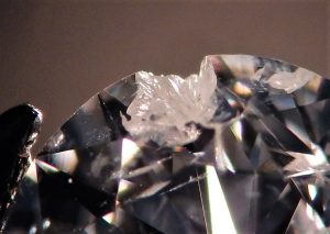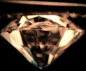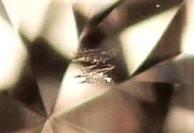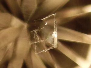 This is my current favorite diamond. We have 1000s of diamonds in the store; most are smaller, a few are bigger, lots have a higher colour grade and they run the full range from flawless to heavily included. We find this one so interesting because of the unique inclusion located close to the centre of the table facet. Under minor magnification and even without, the sharp sighted can see a small dark inclusion. As magnification increases this totally random imperfection begins to take on a life of its own. A cute little fruit fly looking insect reveals itself as a group of crystals, needle and a cloud all coming together to form the body, wing, and even the legs if you use a little imagination.