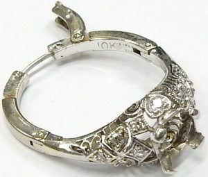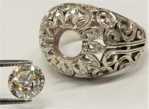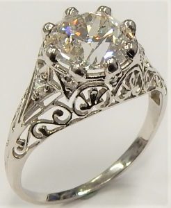 This diamond came to us in what we’re confident was its original antique platinum filigree setting. The ring was in good repair as the original setting had been re-tipped at some point in the past.