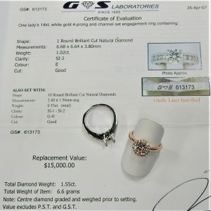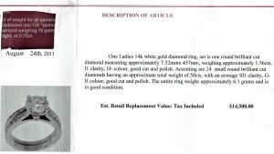 If you like the simple 3.6 gram, size 6 1/2, 18 karat white gold setting with 18 small accent diamonds running down the shoulders, it’s available for just $630.00 more. The shoulder diamonds match the centre diamond displaying an average quality of SI1-F. Included with purchase is the full GIA grading report along with a 2015 insurance appraisal assigning a rather optimistic opinion of $22,000.00 retail replacement value.