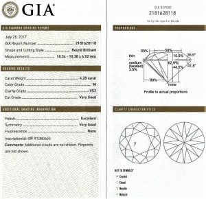 The DNA of Bill Le Boeuf Jewellers has always been about supplying amazing jewellery values to our retail clients for the last 60 years. What you may not know is we also do some wholesale work to qualified vendors. While it’s easier selling to another retail jeweller we get far more satisfaction when one of our regular customers picks up one of our products. Our latest estate offering just came back from The Gemological Institute of America in New York. We use GIA as an impartial judge to certify many of our larger estate and new diamonds. The full and comprehensive plotted diamond grading report (July 11 2018) can be seen online here. GIA are universally accepted as the authority when it comes to diamond certification. They don’t supply appraisals and they’re not involved in the commerce of diamonds or jewellery. This ensures they are impartial to all, unlike most of the insurance appraisals we encounter. Maybe you should ask yourself; why don’t all jewellers supply GIA reports with their diamonds? We’ve also spent a little more money having the GIA certificate number laser engraved on the girdle.