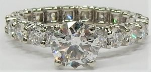 The full report can be seen online here. This is a pretty big looking diamond. Its average diameter of 7.43mm is much larger than most 1.50 carat modern diamonds. The diamond came to us in an antique inspired modern manufactured 18 karat white gold filigree ring, bead set with 26 modern round brilliant cut diamonds.