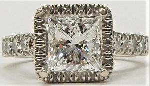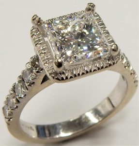 The square halo features decorative filigree accents and 20 hand set petite round brilliant cut diamonds. The 6.95mm wide shoulders are covered by an additional 42 round and princess cut diamonds, bead, and channel set halfway across the ring. Together they equal 1.50 carats of VS-H quality, perfectly matching their main diamond.