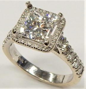Many diamond cutters manufacture efficiently so as to produce diamonds that weigh as much as possible at the expense of potential sparkle and brilliance. All this talk leads us to one of the best looking (best cut) princess cut diamonds we’ve ever had come through our estate department. It certainly doesn’t hurt that the diamond already had a lot going for it. Over 2 carats in weight, VS2 clarity, F colour, no fluorescence, and just 0.0027% (0.02mm) of being dead square. Those details are straight forward and easy to compare against other princess cut diamonds. It’s the geometry of the cut where this diamond absolutely excels. Of the 35,000 princess cut diamonds on our database, only 36 have the same or better geometry. When we also factor in size, colour, polish, symmetry, and fluorescence characteristics, that number drops to ZERO! We can’t find a princess cut diamond close to this size and quality anywhere this nice at any price, end of story. To see a short Youtube video of the diamond click here. My amateur video was shot without any special lighting, just regular fluorescent ceiling lights in my office with my old cell phone. This diamond is already set in a traditional platinum double gallery setting with a thin 2.25mm wide round shank.