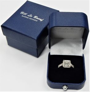 Where do we begin describing a ring like this? It would take a post thousands of words long for us to adequately describe the attributes of this ring and the absolute value it represents. We’ll start with the facts. When it comes to our estate diamond rings and other jewellery, wholesale is the new retail at Bill Le Boeuf Jewellers. You’d think with all those inexpensive lab-grown synthetic diamonds flooding the market, natural diamonds would be seeing some pricing pressures. Such is not the case, in fact, the opposite is true; while lab-grown synthetics are falling in price every day, properly graded, natural diamonds have seen price increases over the last year. Did you know that synthetic diamonds have fallen in price to only around 10% of their natural counterparts? If you’re considering a synthetic, laboratory-grown diamond, make sure you are getting it at close to a 90% discount compared to the real thing. The diamond in this beautiful 18 karat white gold halo setting is 100% natural in every way. The only thing humans contributed to Mother Nature’s creation was the skill to transform the rough crystal into the excellent cut, finished round brilliant cut diamond.