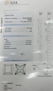 The Gemological Institute of America has certified the diamond a SI2-F with very good symmetry, very good polish and no fluorescence. Click here to see to full September 2016 report. You seldom see Asscher cuts although they are becoming one of the more asked for specialty cuts. The clean tailored symmetry and parallel facets are a refreshing optical treat compared to the more common brilliant cut, square princess and round diamonds. If you try to compare similar weight Asschers you’ll notice most only measure around 6.3mm x 6.3mm. This is because most are cut much deeper in an effort to conserve weight without any improved visual impact. Trust me when I say finding a Asscher cut with a depth percentage under 60 is exceedingly rare and very desirable. The diamond is currently set in a high quality 18 karat yellow gold and platinum 7.6 gram setting (available separately for $1000.00). It’s ready to go as a fantastic engagement ring.