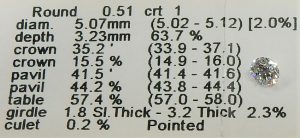 Initially I had hoped to maintain a re-cut weight of at least 0.70 carats but after consultation with our master diamond cutter he said to hold 0.70 plus carats the diamond would only rate a good or maybe a weak very good cut. Rather than compromise the cutting standards to get a heavier albeit less brilliant diamond we opted to go for an exceptional cut and I’m happy we did. The freshly remanufactured diamond now weights just 0.63 carat (over 28% lighter the original) but holy *#@%! does it ever sparkle. The cut report shows every aspect of geometry is ideal.