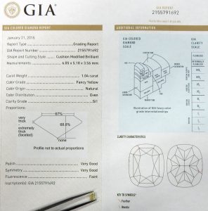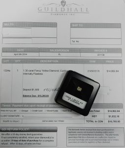 What sort of jewellery do you think this rare diamond would look good in? I’m thinking perhaps a drop pendant or maybe a halo style ring with contrasting white diamonds. The possibilities are only limited by your imagination. This diamond was originally purchased through Guild Hall Wealth Management. You may have heard their Sunday morning program on AM 640 Toronto. The diamond comes with lots of articles copied from Money Magazine, The Wall Street Journal, Forbes.com, and various other internally produced documents from Gild Hall.