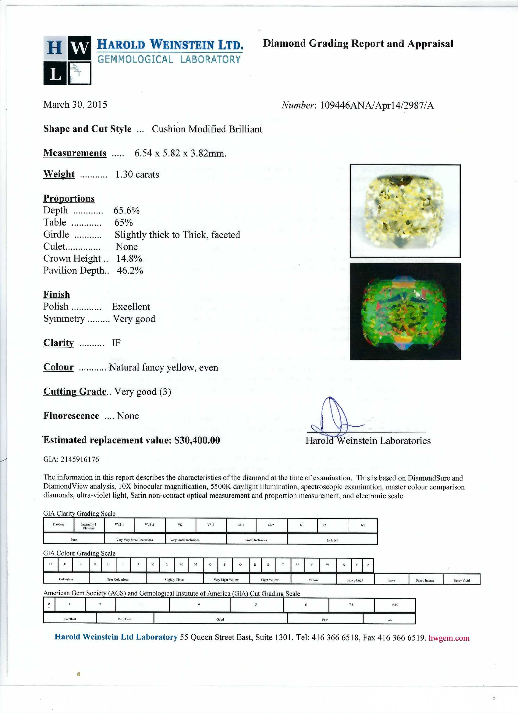 A March 2015 Diamond Grading Report and Appraisal from Harold Weinstein suggests an estimated replacement value of $30,400.00 CAD.