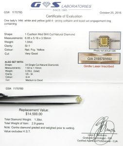 1.46 carat VVS2 fancy vivid yellow colour enhanced round brilliant cut diamond GIA certified #5121011261. Details of the certificate can be viewed on GIA’s website by clicking here. The loose diamond is available alone for $9,250.00 CAD. This complete ring can be viewed in the estate rings over $5,000.00 section. Stock #e737.
